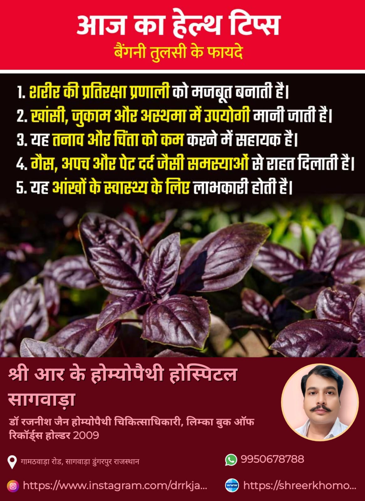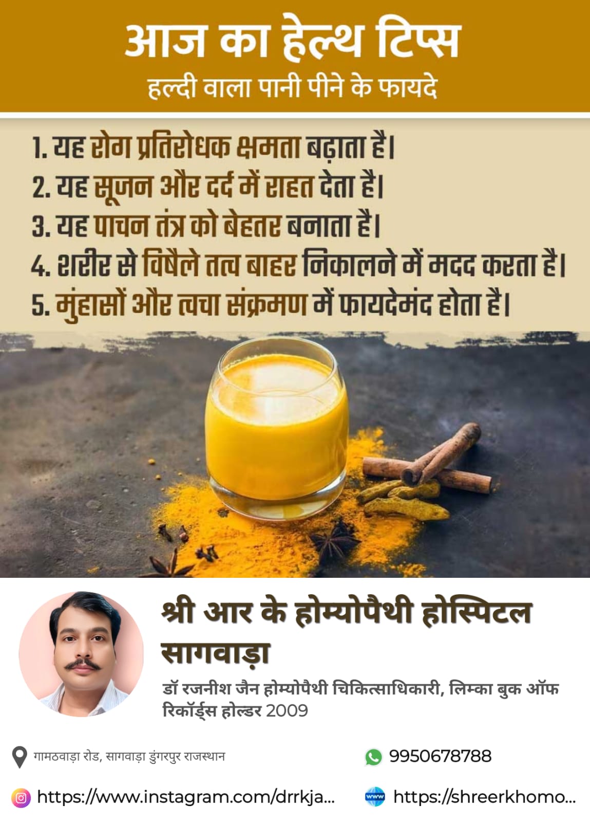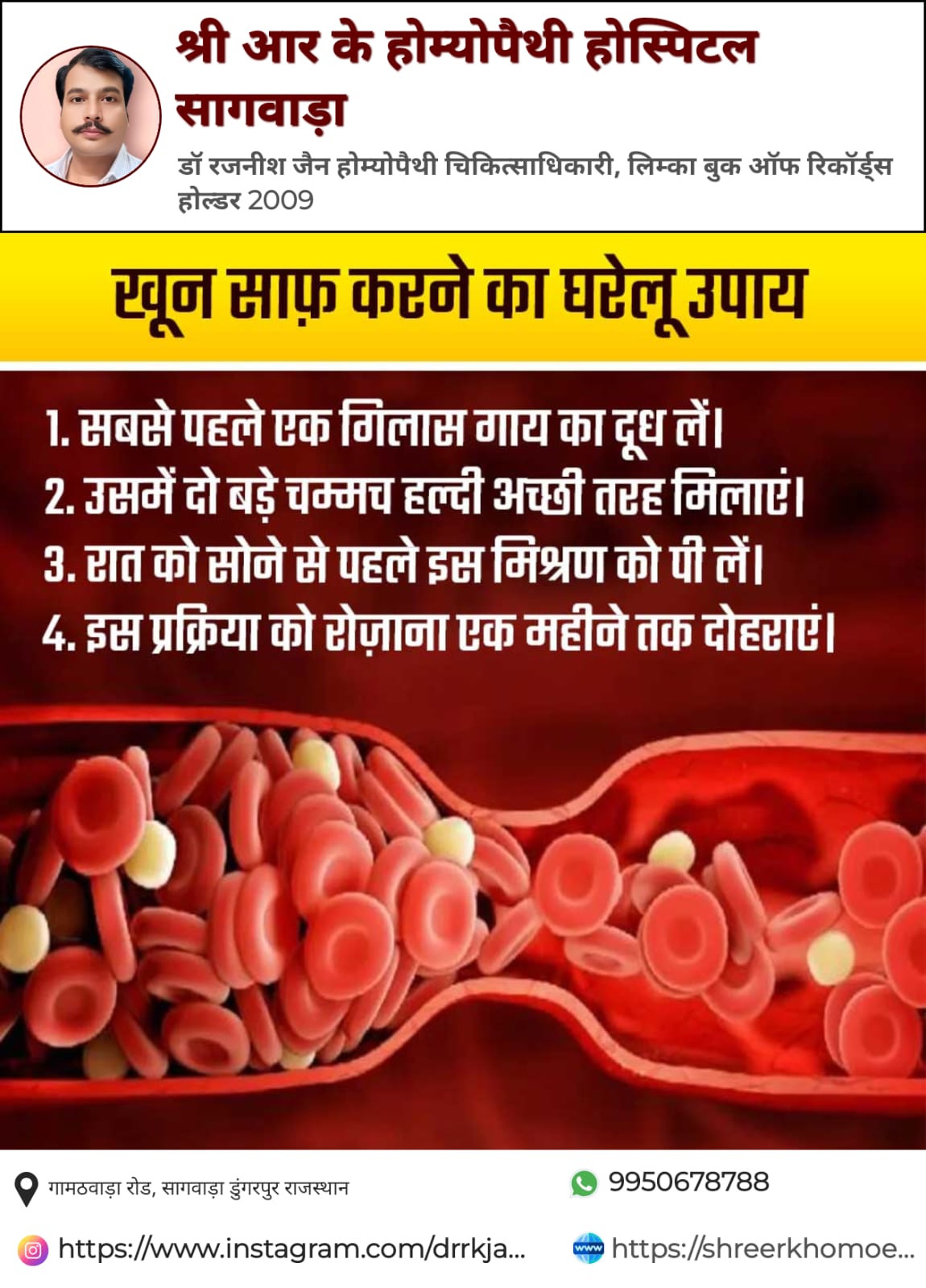 Dr. Rajneesh Jain provides consultation at Shree R K Homeopathy Hospital Sagwara in Dungarpur, Dungarpur. The address of the clinic is: Gamathwara Road. This clinic is easily reachable by public transport or via private conveyance. You can book an appointment with Dr. Rajneesh Jain for an in-clinic consultation, instant consultation or video consultation, as per the doctor’s availability