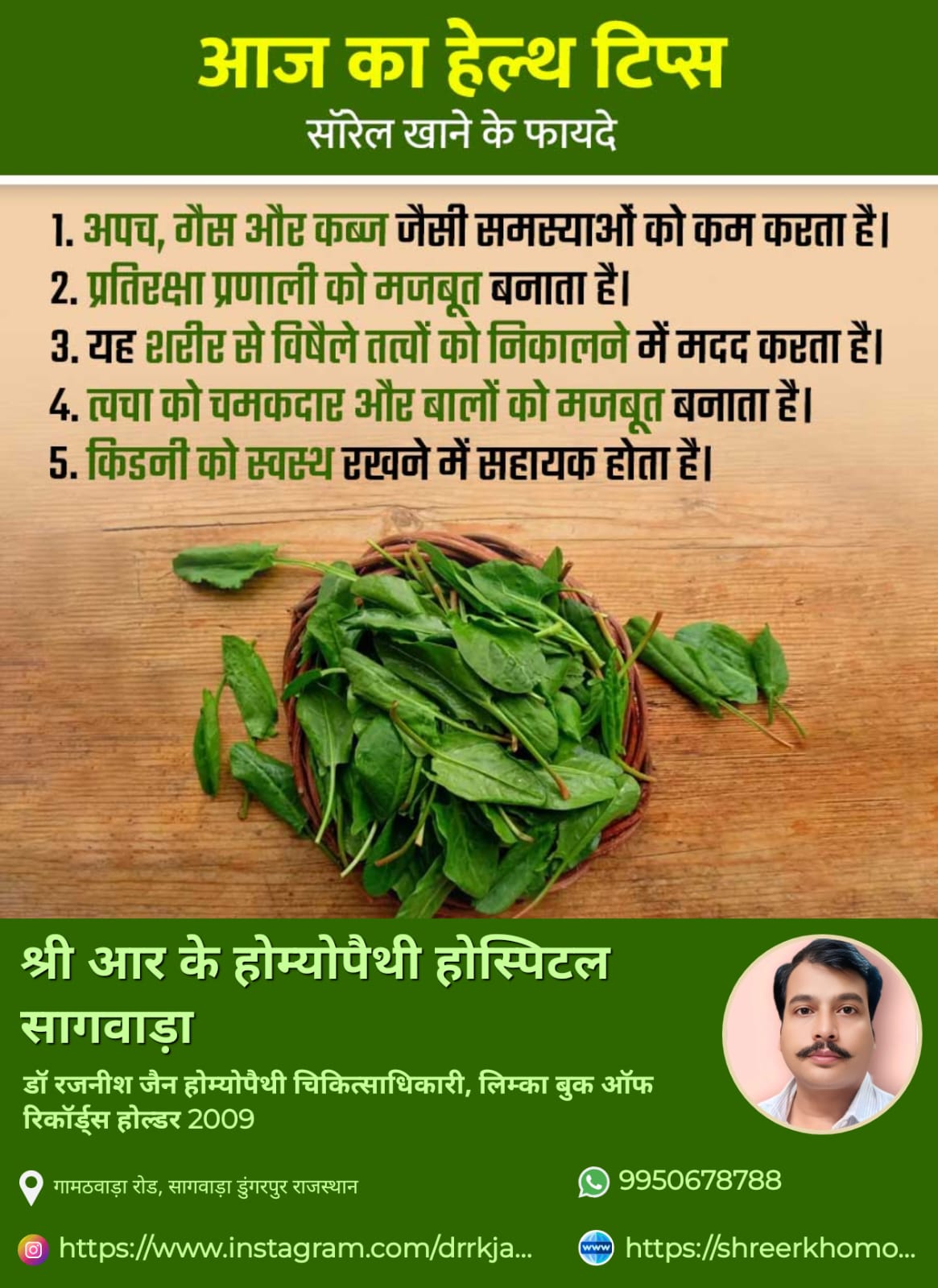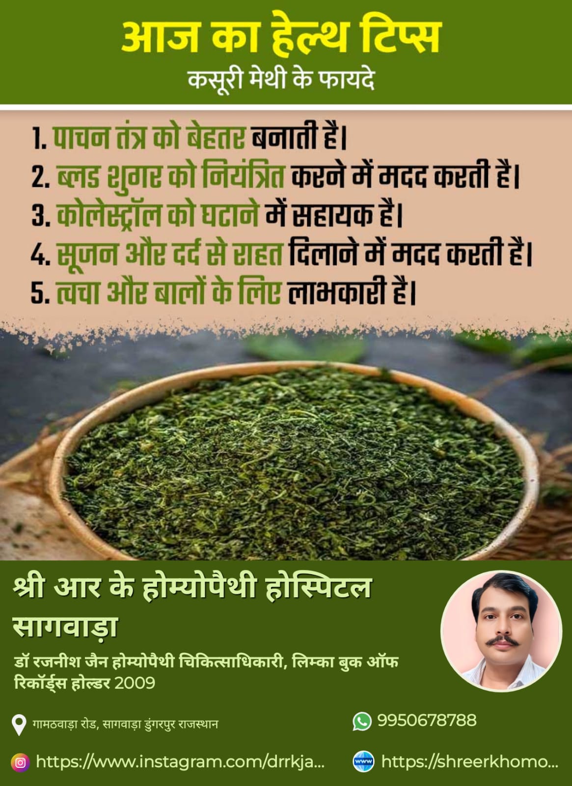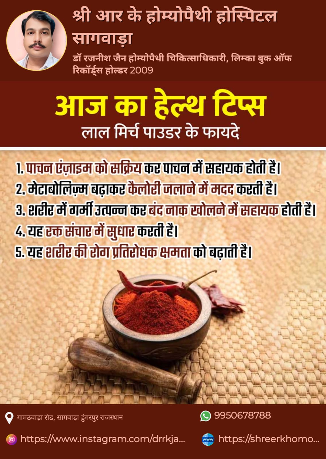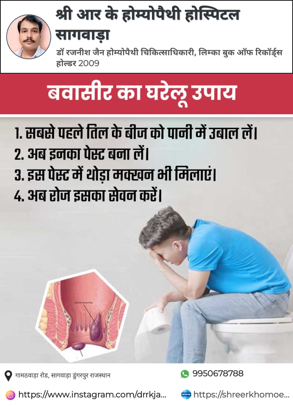 Dr. Rajneesh Jain provides consultation at Shree R K Homeopathy Hospital Sagwara in Dungarpur, Dungarpur. The address of the clinic is: Gamathwara Road. This clinic is easily reachable by public transport or via private conveyance. You can book an appointment with Dr. Rajneesh Jain for an in-clinic consultation, instant consultation or video consultation, as per the doctor’s availability